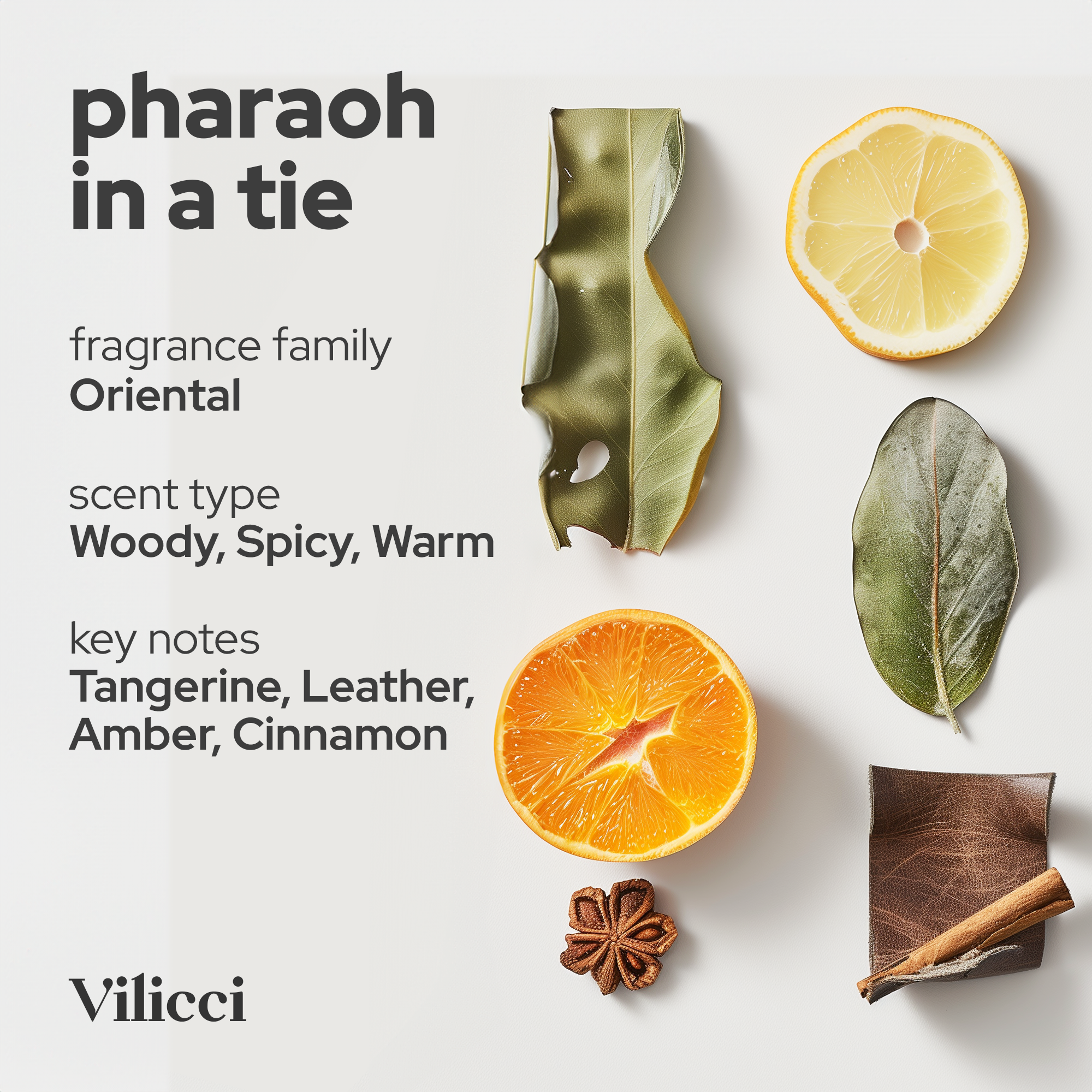 Pharaoh In a Tie is a fragrance that bridges the gap between the ancient and the contemporary, offering a scent that is both light and welcoming, yet undeniably sultry and complex. It marries the bright, zesty appeal of tangerine with the deep, resinous warmth of amber, and the exotic spice of cinnamon, creating a blend that is both comforting and irresistibly intriguing. The addition of leather lends a creamy, woody depth, unveiling a fragrance that is rich in character and steeped in sensuality.